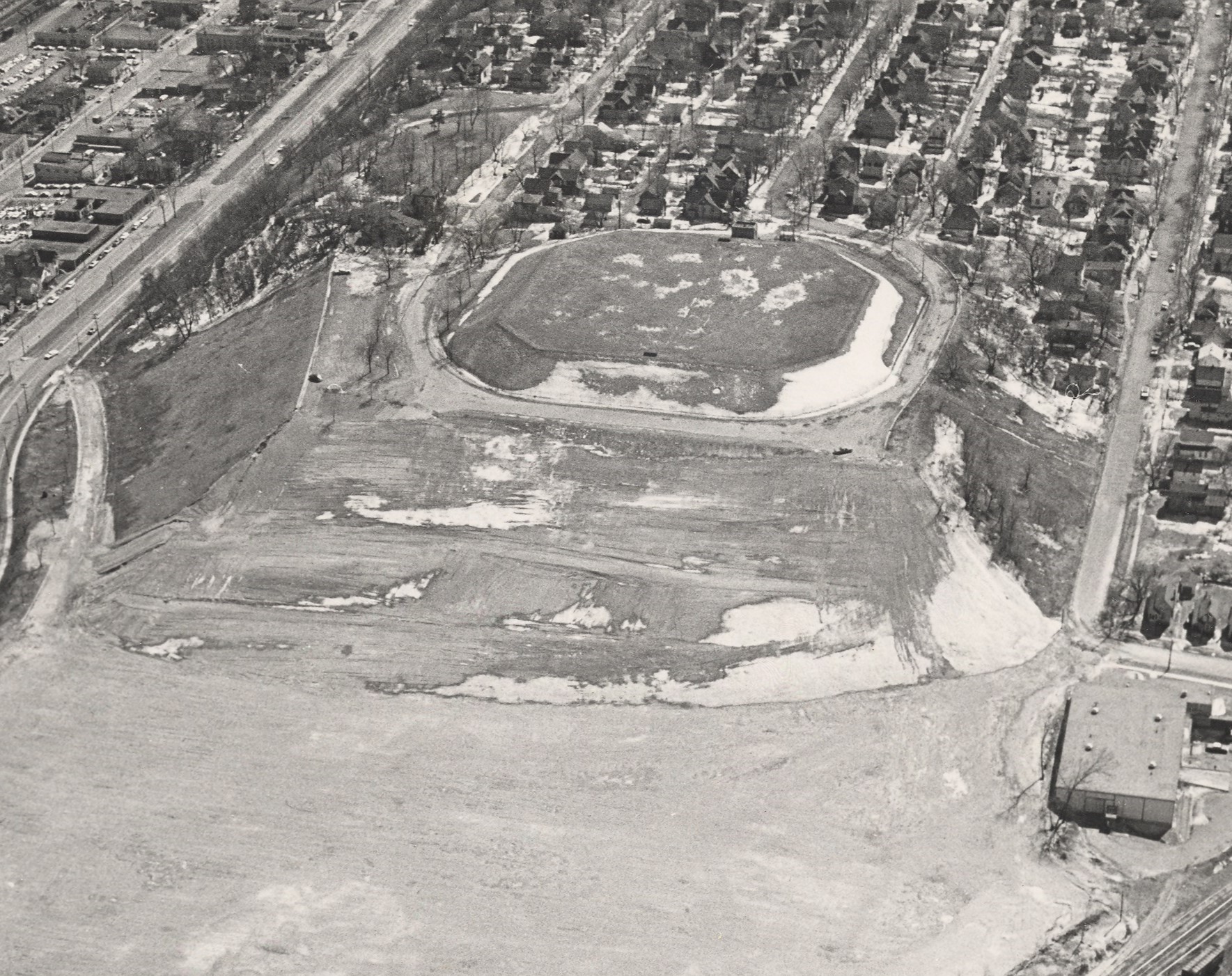 Although Morris fundamentally disagreed with Smithson that “art could reclaim wasted sites,” he was inspired by Smithson’s unfinished land reclamation projects. In Grand Rapids, Michigan, Morris designed Project X (1974) to stabilize a deteriorating reservoir hillside with a crossing walkway transposed from an X-shaped geoglyph built by the Nazca people in Peru, which he had traveled to see the previous year. The Women’s Committee of the Grand Rapids Art Museum coordinated private contractors, city departments, and a federal Art in Public Places grant to successfully transform the degraded municipal land into green public space.